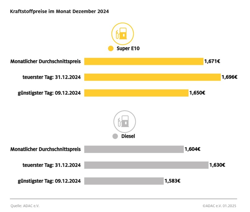Zum Jahresende 2024 sind die Preise für beide Sorten nochmal angestiegen. Wie die aktuelle Auswertung für Dezember zeigt, kostete ein Liter Super E10 im Monatsmittel 1,671 Euro und damit 1,3 Cent mehr als im Vormonat. Für einen Liter Diesel mussten die Autofahrerinnen und Autofahrer im Schnitt 1,604 Euro bezahlen, das sind 1,6 Cent mehr im November.