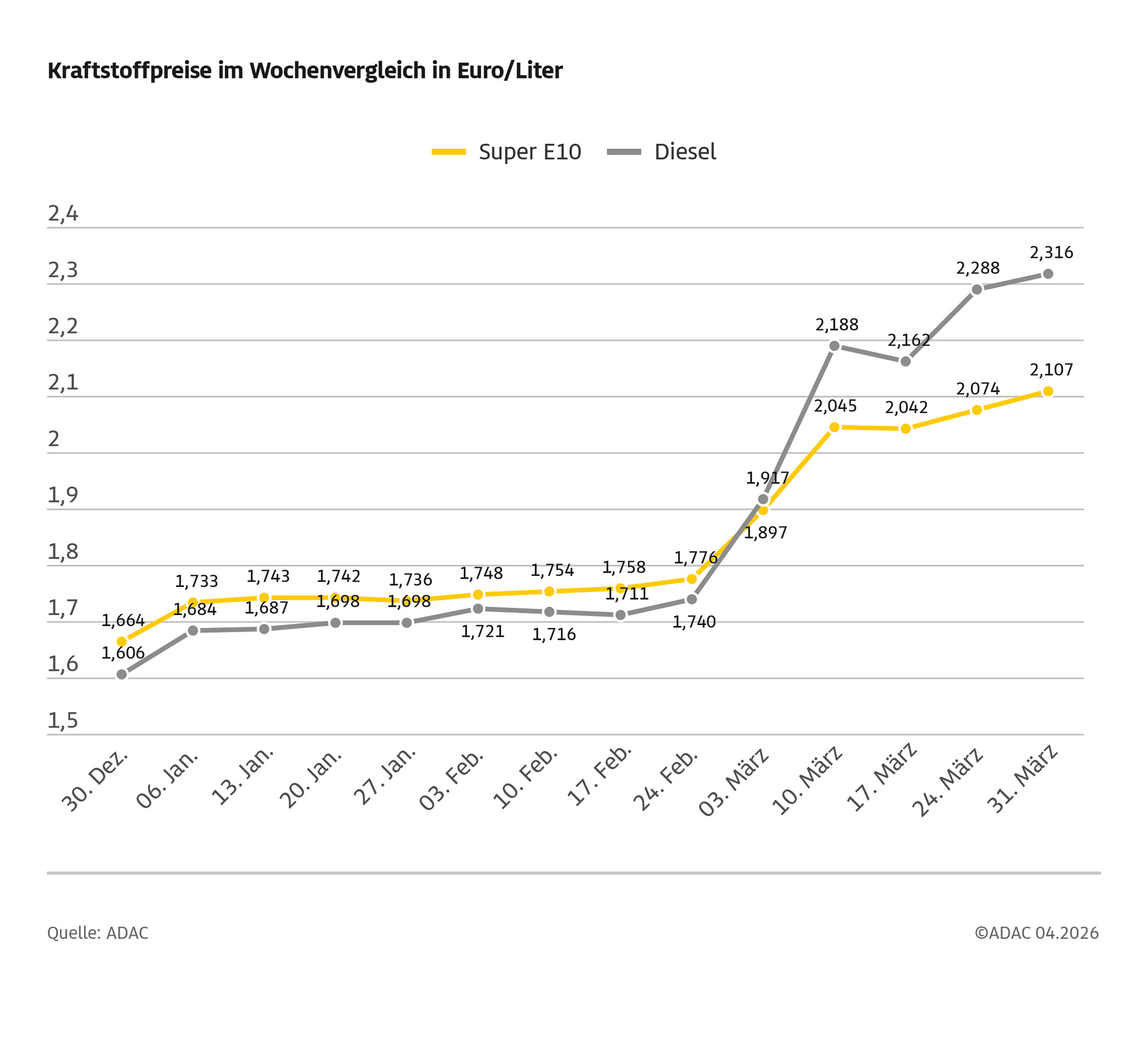München (ots) – Die Kraftstoffpreise sind im März 2026 massiv gestiegen. Wie die aktuelle ADAC Auswertung der Kraftstoffpreise in Deutschland zeigt, kostete ein Liter Diesel im Monatsmittel 2,164 Euro – nie zuvor war Diesel im Monatsschnitt teurer! Teuerster Diesel-Monat aller Zeiten war bisher der März 2022, kurz nach Beginn des Ukraine-Kriegs, mit durchschnittlich 2,140 Euro. Auch Super E10 hat sich zuletzt sehr stark verteuert und kostete im März im Schnitt 2,022 Euro. Damit blieb der Preis zwar noch um 4,7 Cent unter dem des Rekordmonats März 2022, als für einen Liter Super E10 im Schnitt 2,069 zu bezahlen waren. Allerdings war der März damit für Super E10 der drittteuerste Monat aller Zeiten.