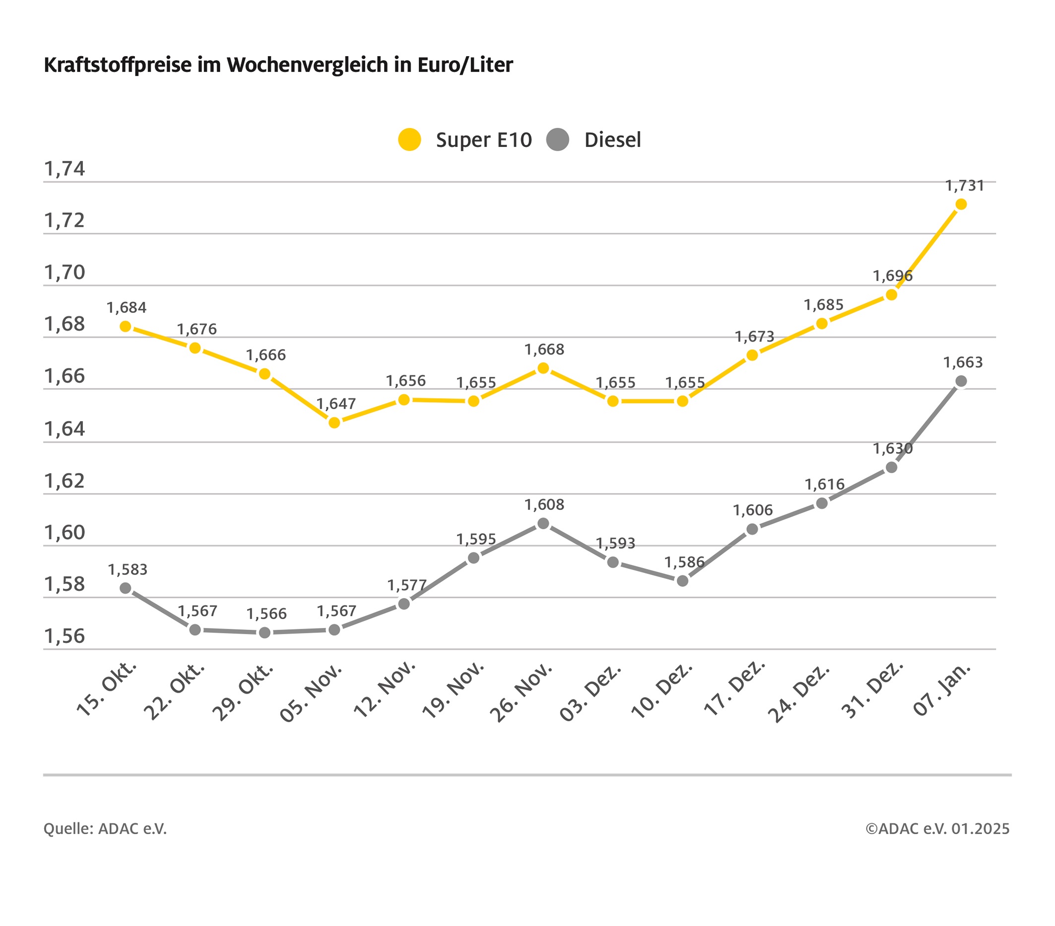 München (ots) –Die Kraftstoffpreise an den Tankstellen in Deutschland sind in der ersten Januarwoche im Vergleich zur Vorwoche kräftig gestiegen. Der Anstieg kommt jedoch nicht gänzlich unerwartet, da die CO2-Abgabe zum Jahreswechsel erneut angehoben wurde und sich damit auch das Tanken verteuert hat.Wie die aktuelle ADAC Auswertung der Kraftstoffpreise in Deutschland ergibt, kostet ein Liter Super E10 im Mittel 1,731 Euro und damit 3,5 Cent mehr als in der Vorwoche. Für einen Liter Diesel müssen die Autofahrerinnen und Autofahrer derzeit im Schnitt 1,663 Euro bezahlen – ein Plus von 3,3 Cent.