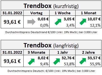 Heizöl bleibt grundsätzlich recht teuer, doch nachdem die Rohölbörsen gestern ein gutes Stückchen nachgegeben haben, können Verbraucher sich heute im Bundesdurchschnitt über Preisnachlässe von über 3,80 Euro freuen. Auch auf Wochensicht sind die Heizölpreise gesunken.   Entsprechend zeigt die Trendbox in dieser Woche nach langer Zeit erstmals wieder zwei rote Pfeile. Im Vergleich zu gestern…