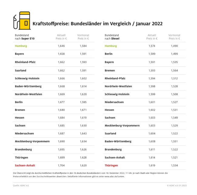München (ots) – Die Kraftstoffpreise sind in ganz Deutschland auf sehr hohem Niveau. Für die Autofahrer in Sachsen-Anhalt und Thüringen kommt Tanken derzeit jedoch besonders teuer. Wie die heutige ADAC Auswertung der Kraftstoffpreise in den 16 Bundesländern zeigt, kostet ein Liter Super E10 in Sachsen-Anhalt zurzeit im Schnitt 1,704 Euro. In Thüringen kostet E10 mit…