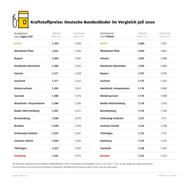 München (ots) – Auch in Corona-Zeiten zeigen die Kraftstoffpreise in Deutschland starke regionale Abweichungen. Super E10 ist derzeit in Berlin am günstigsten. Laut aktuellem Bundesländervergleich des ADAC kostet ein Liter dort durchschnittlich 1,259 Euro. Auf den Plätzen zwei und drei folgen Rheinland-Pfalz (1,263 Euro/Liter) und Bayern (1,264 Euro/Liter). Schlusslicht ist der Stadtstaat Hamburg, wo man für einen…