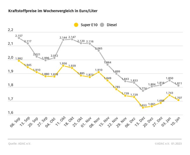 München (ots) – Leichte Entspannung an den Zapfsäulen: Nachdem die Spritpreise seit Mitte Dezember zuletzt um bis zu neun Cent je Liter gestiegen waren, zeigt sich nun ein spürbarer Rückgang. Laut aktueller ADAC Auswertung der Kraftstoffpreise in Deutschland kostet ein Liter Super E10 im bundesweiten Mittel 1,707 Euro – ein Minus von 3,6 Cent gegenüber der…