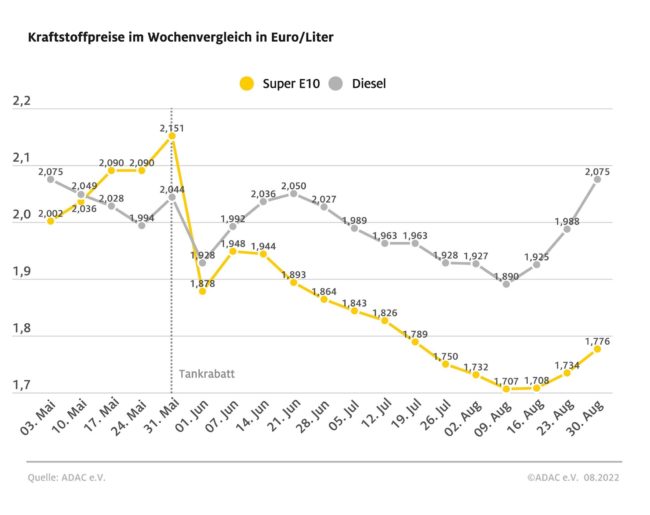 ADAC Ende des Tankrabatts lässt Spritpreise explodieren – Benzinpreis steigt seit letzter Woche um fast 22 Cent, Diesel um über 8 Cent – Diesel um 16,5 Cent teurer als Super E10