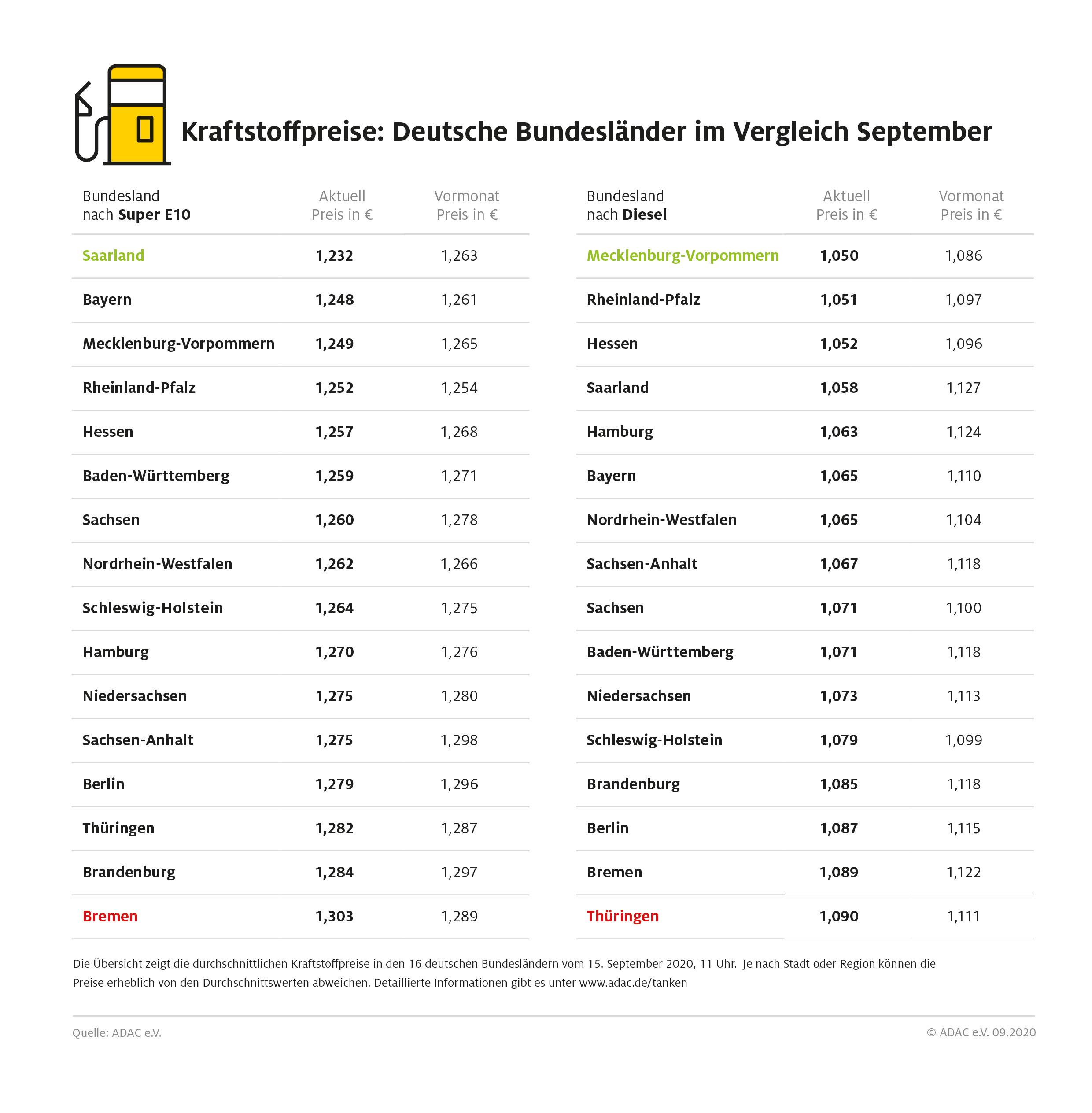 Die regionalen Unterschiede bei den Kraftstoffpreisen in Deutschland haben sich wieder vergrößert. Dies zeigt der aktuelle Bundesländervergleich des ADAC. Benzin ist derzeit im Saarland am günstigsten. Dort kostet ein Liter Super E10 durchschnittlich 1,232 Euro und damit 7,1 Cent weniger als in Bremen, wo Super E10 am teuersten ist. Noch im August lag der mittlere Preisunterschied zwischen billigstem und teuerstem Bundesland bei 4,4 Cent je Liter.