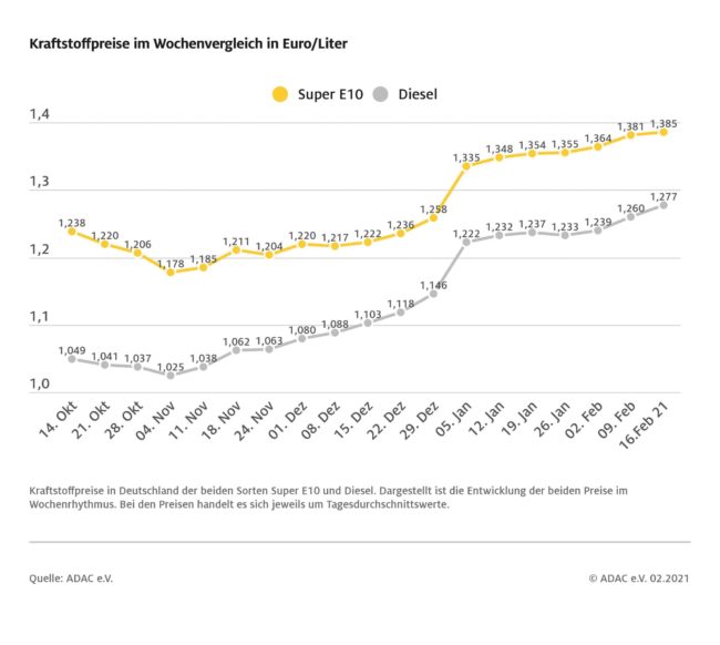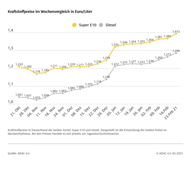 München (ots) Beide Kraftstoffsorten um 4,3 Cent je Liter teurer als im Januar Der Preisanstieg an den deutschen Tankstellen hat sich im Februar fortgesetzt. Sowohl Benzin als auch Diesel verteuerten sich im Mittel im Vergleich zum Januar um jeweils 4,3 Cent je Liter. Dies zeigt die monatliche ADAC Auswertung der Kraftstoffpreise. Danach mussten die Fahrer von…