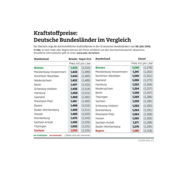München (ots) Die Durchschnittspreise für Benzin und Diesel in den Bundesländern weisen erkennbare Unterschiede auf. Am günstigsten tanken Autofahrer derzeit im Stadtstaat Bremen: Ein Liter Super E10 ist hier mit durchschnittlich 1,434 Euro um 7,2 Cent billiger als im teuersten Bundesland Sachsen (1,506 Euro). Ein Liter Diesel kostet in Bremen im Mittel 1,240 Euro und damit…