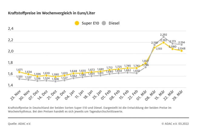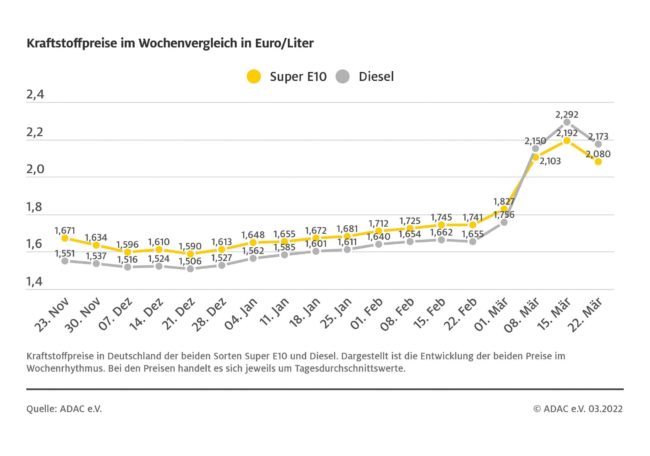 München (ots) – Einen derart massiven Anstieg der Kraftstoffpreise wie im März 2022 gab es an den Tankstellen in Deutschland noch nie. Innerhalb von nicht einmal zwei Wochen sprang der Benzinpreis im abgelaufenen Monat um 37,6 Cent nach oben, Diesel verteuerte sich innerhalb von neun Tagen um 56,5 Cent. Dies zeigt die aktuelle ADAC Auswertung…