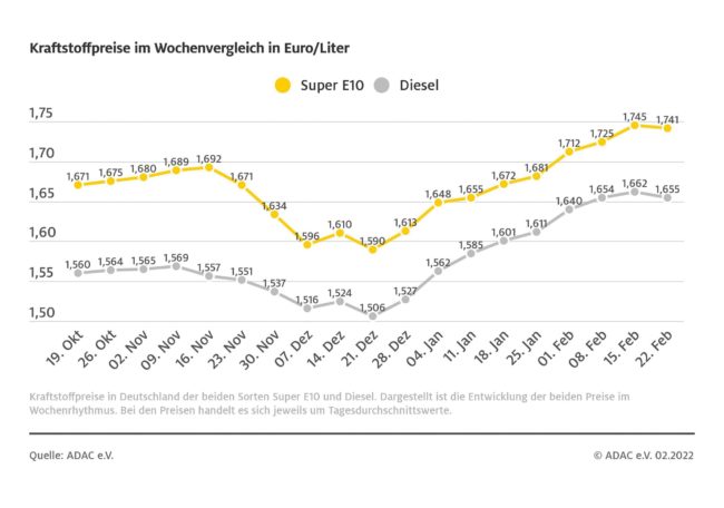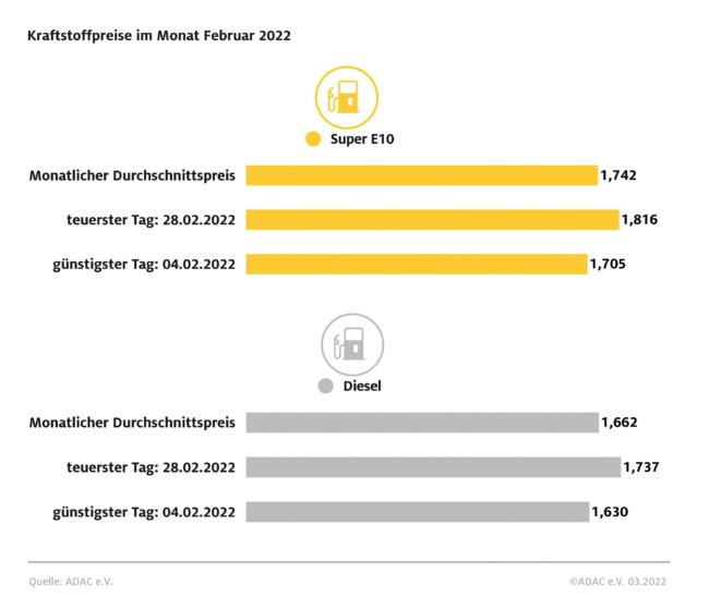 München (ots) – Die Kraftstoffpreise sind im Februar erneut deutlich gestiegen. Beide Sorten kletterten am Monatsende auf neue Allzeithochs und auch im Monatsmittel wurden neue Rekordmarken erreicht. Dies zeigen die Daten des ADAC in seiner monatlichen Auswertung der Kraftstoffpreise. Danach kostete ein Liter Super E10 im Monatsdurchschnitt 1,742 Euro und damit 7,2 Cent mehr als im…