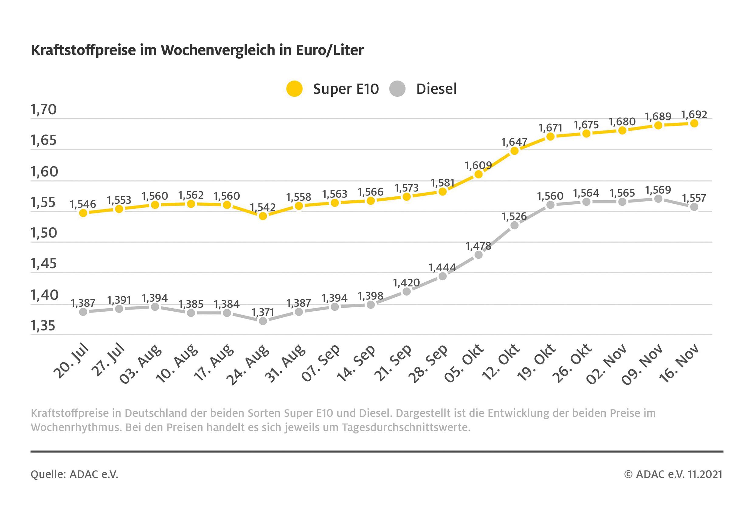 Kraftstoffpreise im Wochenvergleich. Quelle: ADAC