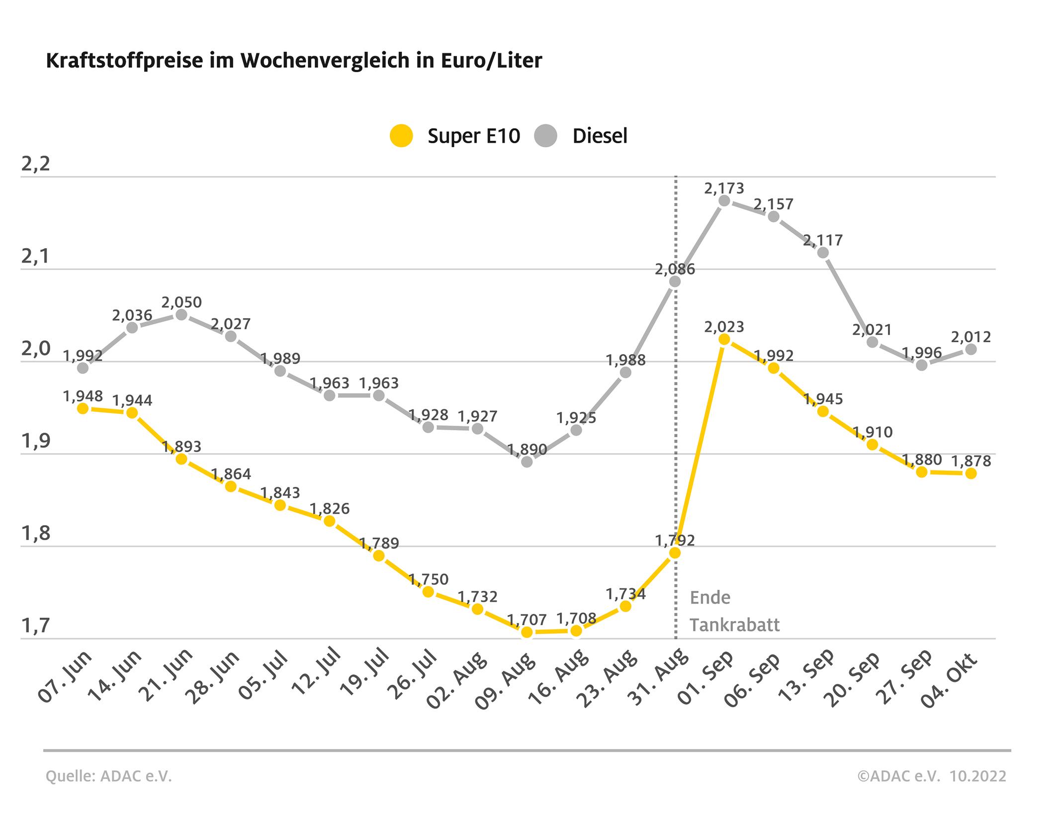 Kraftstoffpreise im Wochenvergleich. Quelle: ADAC e.V.