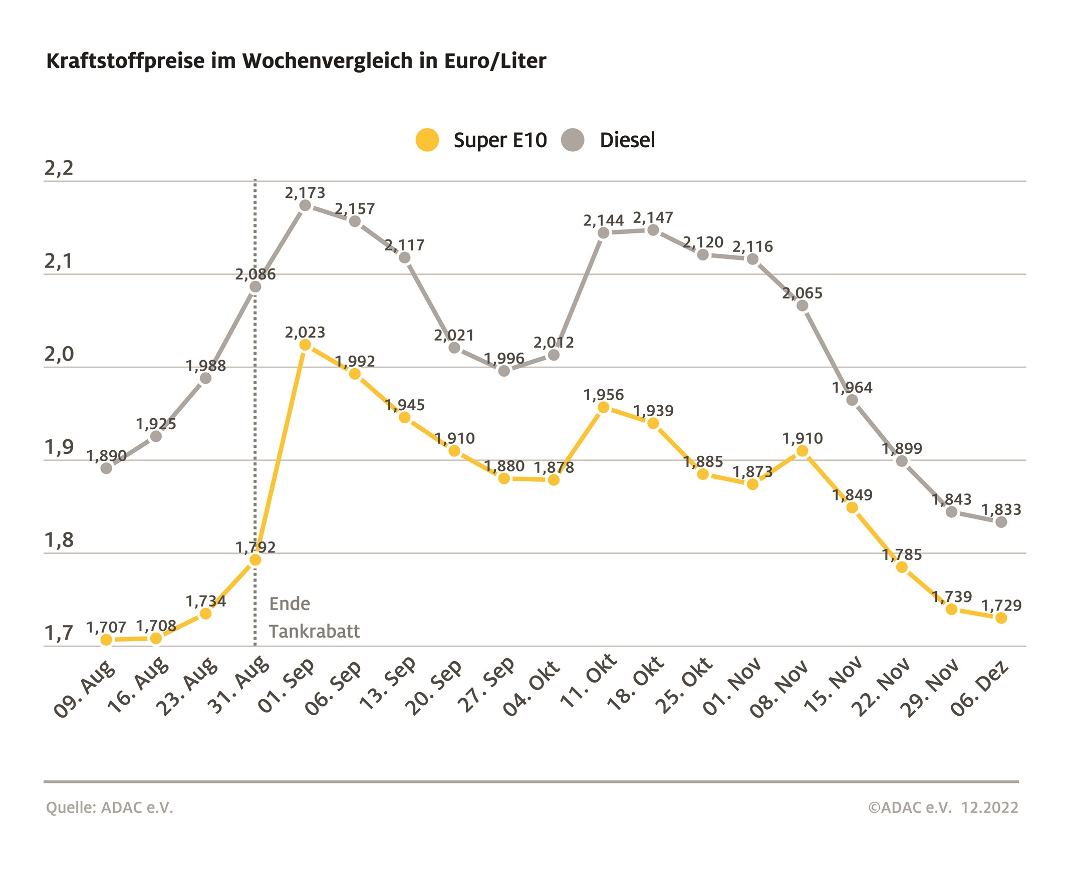 Tanken ist gegenüber der Vorwoche erneut preiswerter geworden, der Preisrückgang hat sich jedoch deutlich abgeschwächt – das zeigt die aktuelle ADAC Auswertung der Kraftstoffpreise in Deutschland. Danach kostet ein Liter Super E10 im bundesweiten Mittel 1,729 Euro und damit um einen Cent weniger als vor Wochenfrist. Ebenfalls um einen Cent billiger ist Diesel: Im Schnitt müssen die Autofahrer für einen Liter derzeit 1,833 Euro bezahlen.