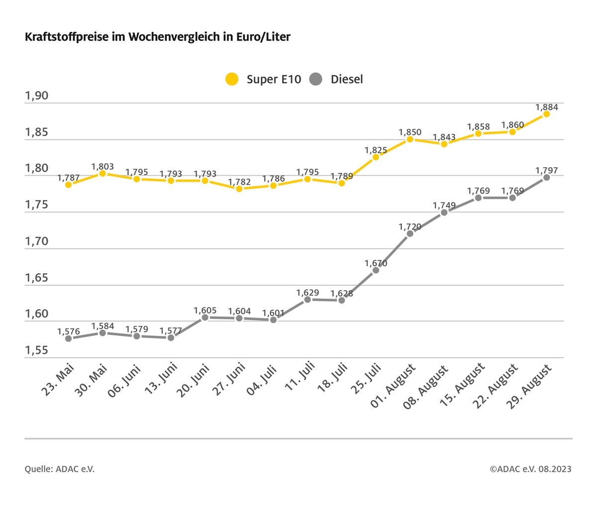 Nachdem sich in der Vorwoche die Kraftstoffpreise kaum veränderten, geht es nun erneut deutlich nach oben. Die ADAC Auswertung der Preise von über 14.000 Tankstellen in Deutschland zeigt, dass beide Sorten im Vergleich zur Vorwoche um jeweils über zwei Cent gestiegen sind. Ein Liter Super E 10 kostet im Tagesdurchschnitt 1,884 Euro, in der Vorwoche lag der Preis noch um 2,4 Cent niedriger (1,860 Euro). Diesel ist im Vergleich sogar um 2,8 Cent teurer geworden und kostetet 1,797 Euro (Vorwoche: 1,769 Euro).