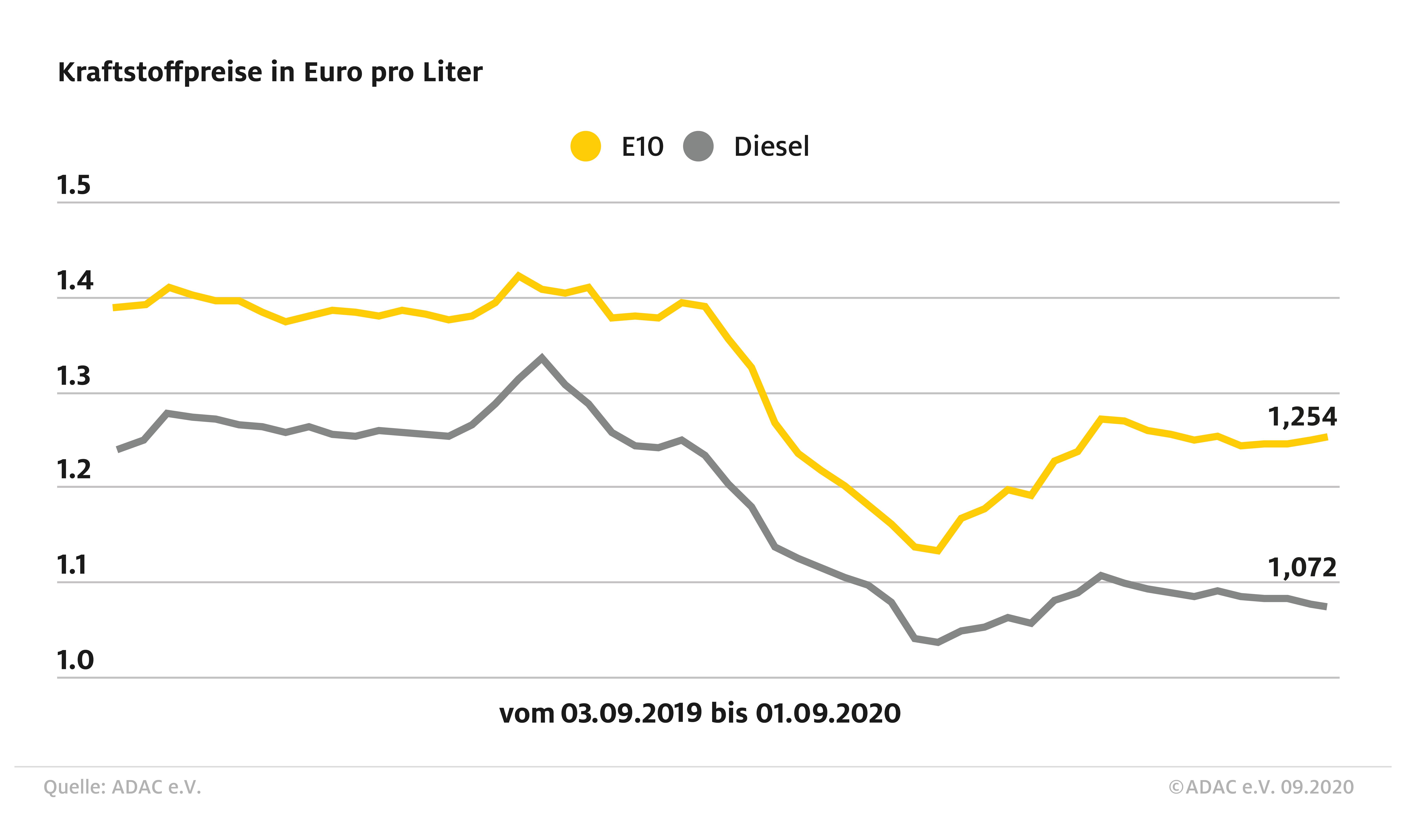 An den Zapfsäulen steigt die Preisdifferenz zwischen Super E10 und Diesel weiter. Wie schon in der Vorwoche erhöht sich der Preis für einen Liter Super E10. Im Bundesschnitt ist ein Anstieg von 0,6 Cent auf 1,254 Euro je Liter zu verzeichnen. Dagegen ist ein Liter Diesel ist im Schnitt erneut günstiger geworden und liegt aktuell bei 1,072 Euro, also um 0,4 Cent niedriger als in der vergangenen Woche.