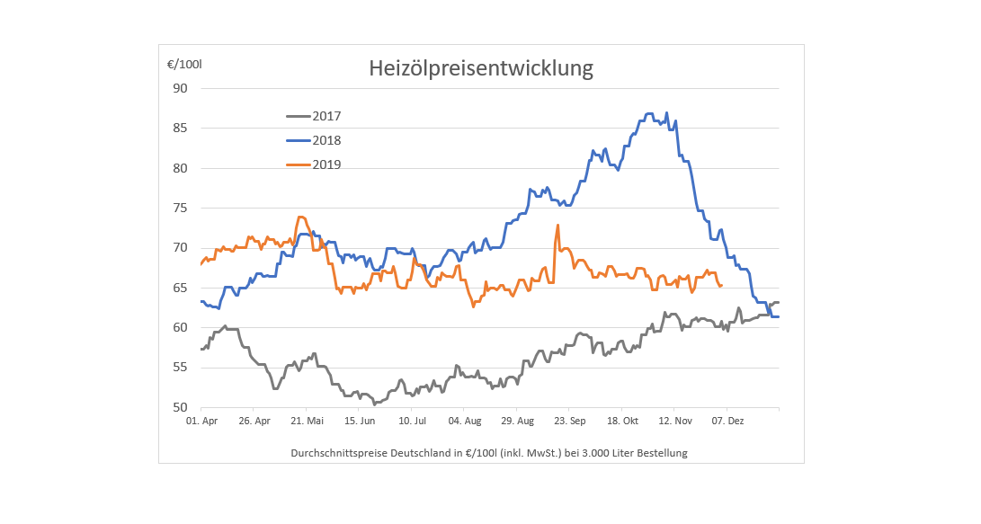 Hinweis: Die genannten Heizölpreise beziehen sich stets auf den deutschlandweiten Durchschnittspreis bei einer Bestellung von 3.000 Liter Heizöl Standard schwefelarm inklusive 19% MwSt.. Durch Transportkosten fallen die Preise regional jedoch unterschiedlich aus. Die Preisspanne zwischen den Regionen kann daher momentan bei bis zu ca. 2,49 Euro pro 100 Liter liegen. Stand der Preise: 04.12.2019