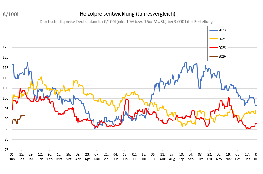 Die genannten Heizölpreise beziehen sich stets auf den deutschlandweiten Durchschnittspreis bei einer Bestellung von 3.000 Liter Heizöl Standard schwefelarm inklusive 19% MwSt. Außerdem fallen durch Transportkosten die Preise regional unterschiedlich aus. Stand der Preise 19.01.2026