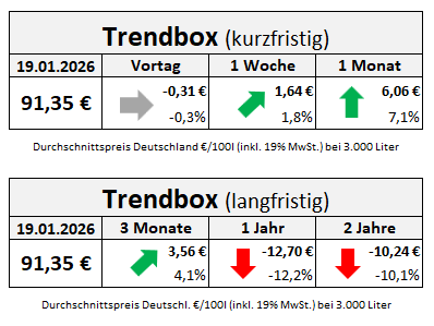 Die durchschnittlichen Heizölpreise der Bundesrepublik sind aktuell knappe -0,31 Euro günstiger als zum vergangenen Wochenende. Dennoch stiegen die Preise in den letzten Wochen erheblich an, weshalb Heizöl zurzeit im Schnitt +1,64 Euro teurer ist als vergangenen Montag. Vor genau einem Monat lagen die Preise in der Bundesrepublik auf einem 4-Jahres-Tief, durch die Vielzahl geopolitischer Spannungen ist der Heizölpreis seitdem um +6,06 Euro angestiegen.