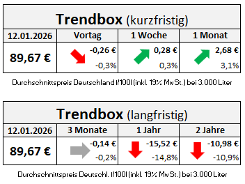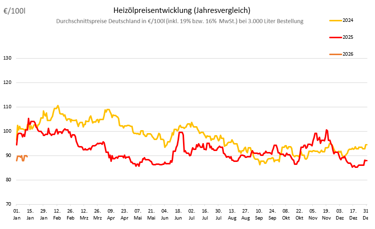 Die genannten Heizölpreise beziehen sich stets auf den deutschlandweiten Durchschnittspreis bei einer Bestellung von 3.000 Liter Heizöl Standard schwefelarm inklusive 19% MwSt. Außerdem fallen durch Transportkosten die Preise regional unterschiedlich aus. Stand der Preise 12.01.2026