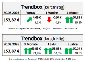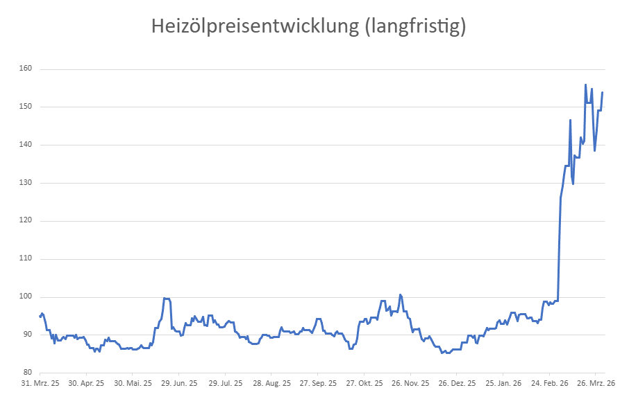 Die genannten Heizölpreise beziehen sich stets auf den deutschlandweiten Durchschnittspreis bei einer Bestellung von 3.000 Liter Heizöl Standard schwefelarm inklusive 19% MwSt. Außerdem fallen durch Transportkosten die Preise regional unterschiedlich aus. Stand der Preise 30.03.2026