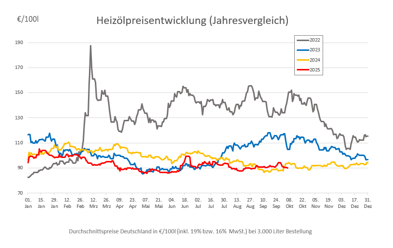 Die genannten Heizölpreise beziehen sich stets auf den deutschlandweiten Durchschnittspreis bei einer Bestellung von 3.000 Liter Heizöl Standard schwefelarm inklusive 19% MwSt. Außerdem fallen durch Transportkosten die Preise regional unterschiedlich aus. Stand der Preise 06.10.2025