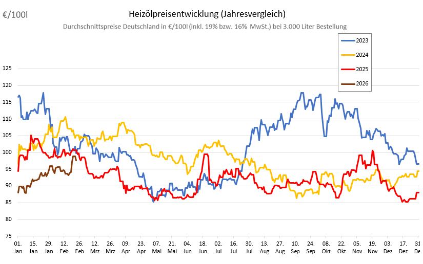 Die genannten Heizölpreise beziehen sich stets auf den deutschlandweiten Durchschnittspreis bei einer Bestellung von 3.000 Liter Heizöl Standard schwefelarm inklusive 19% MwSt. Außerdem fallen durch Transportkosten die Preise regional unterschiedlich aus. Stand der Preise 23.02.2026