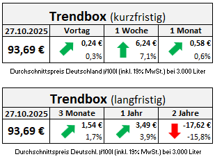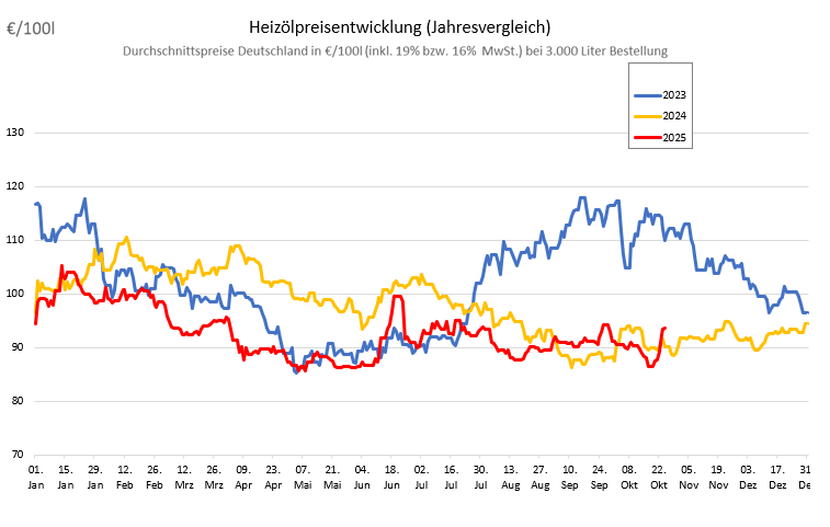 Die genannten Heizölpreise beziehen sich stets auf den deutschlandweiten Durchschnittspreis bei einer Bestellung von 3.000 Liter Heizöl Standard schwefelarm inklusive 19% MwSt. Außerdem fallen durch Transportkosten die Preise regional unterschiedlich aus. Stand der Preise 27.10.2025