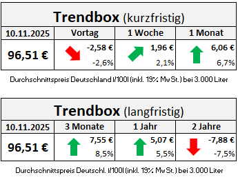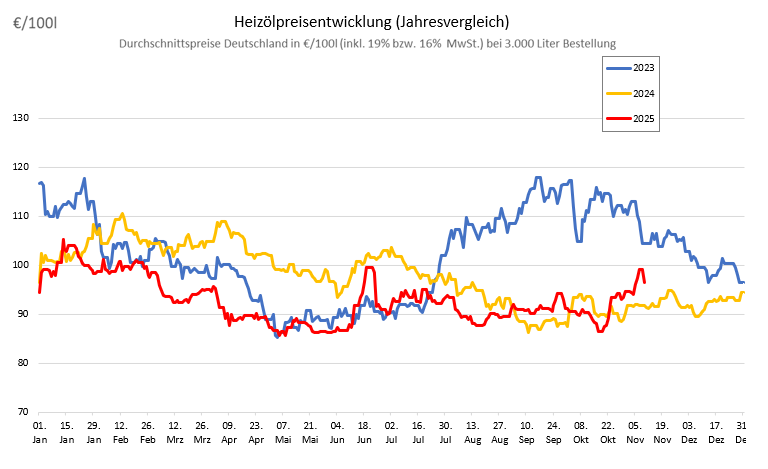 Die genannten Heizölpreise beziehen sich stets auf den deutschlandweiten Durchschnittspreis bei einer Bestellung von 3.000 Liter Heizöl Standard schwefelarm inklusive 19% MwSt. Außerdem fallen durch Transportkosten die Preise regional unterschiedlich aus. Stand der Preise 10.11.2025