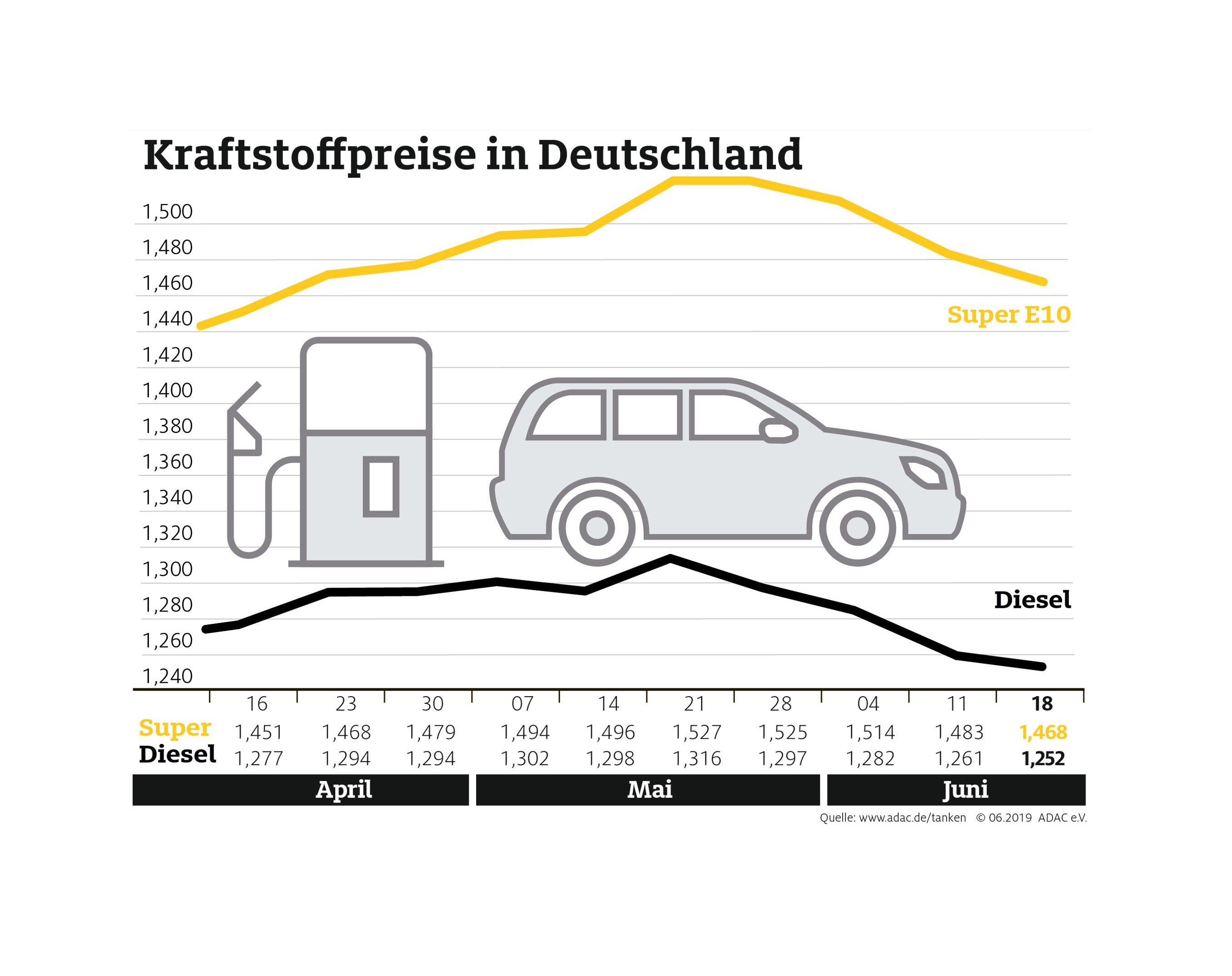 Die Durchschnittspreise sind damit die vierte Woche in Folge gesunken. Die politischen Spannungen im Persischen Golf zeigen bislang keine negativen Auswirkungen. Die Preise für ein Barrel Rohöl der Sorte Brent pendeln wie in der Vorwoche um den Wert von 62 Dollar.
