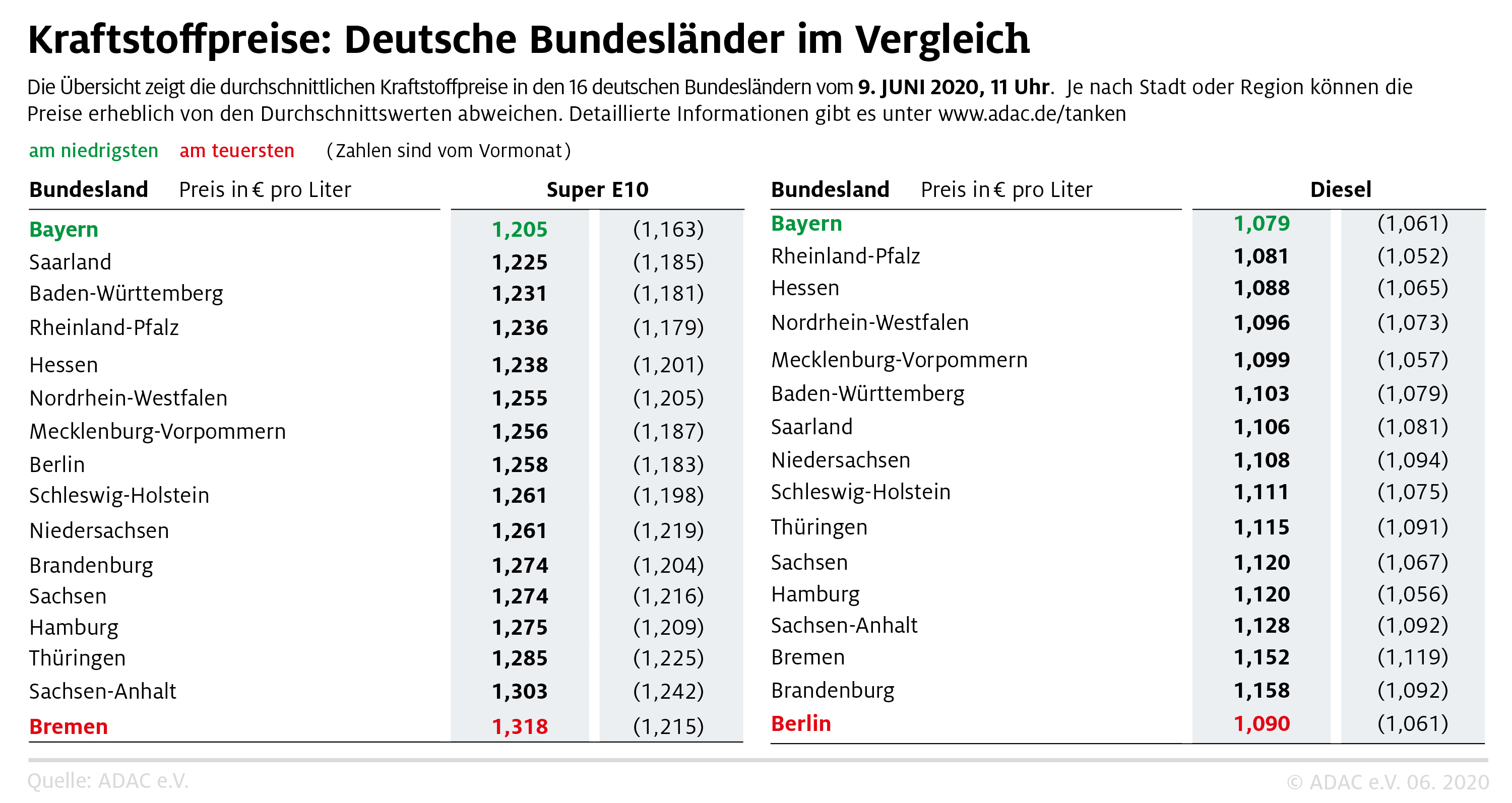 Ein ähnliches Bild zeigt sich bei Diesel. Auch hier ist Bayern mit durchschnittlich 1,079 Euro je Liter am günstigsten. Das sind 10,2 Cent weniger als in Berlin, wo man mit 1,181 Euro je Liter durchschnittlich am meisten bezahlen muss. Die mittlere Preisdifferenz zwischen billigstem und teuerstem Bundesland ist gegenüber April, als sie bei 6,7 Cent je Liter lag, ebenfalls deutlich angewachsen.